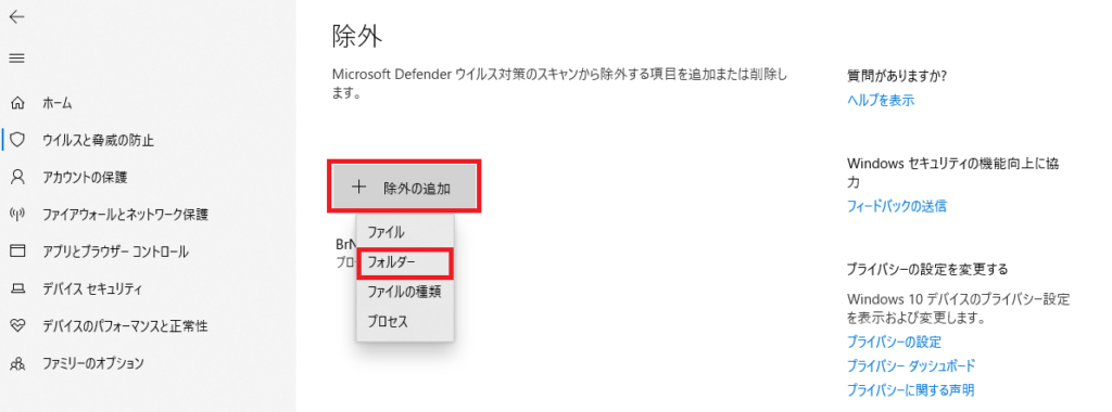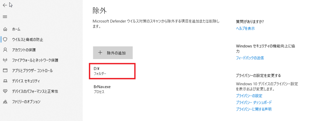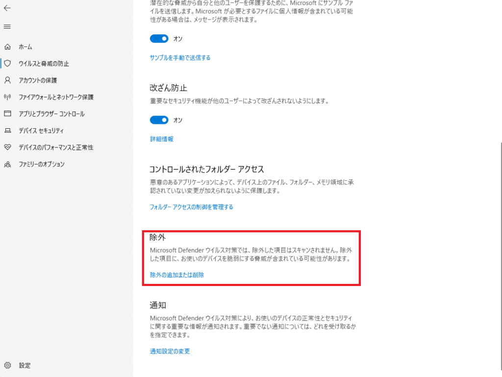 と思ったらWindows Defenderの除外設定を行ってみるのは一つの手段と思います。