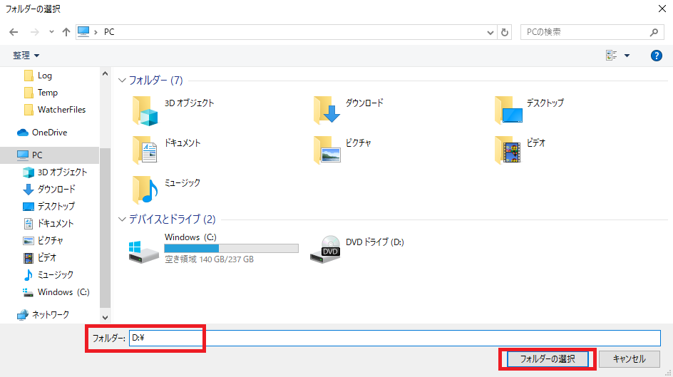 ここで、光学ドライブのドライブレターをフォルダーの枠に入力して、「フォルダーの選択」ボタンをクリックします。