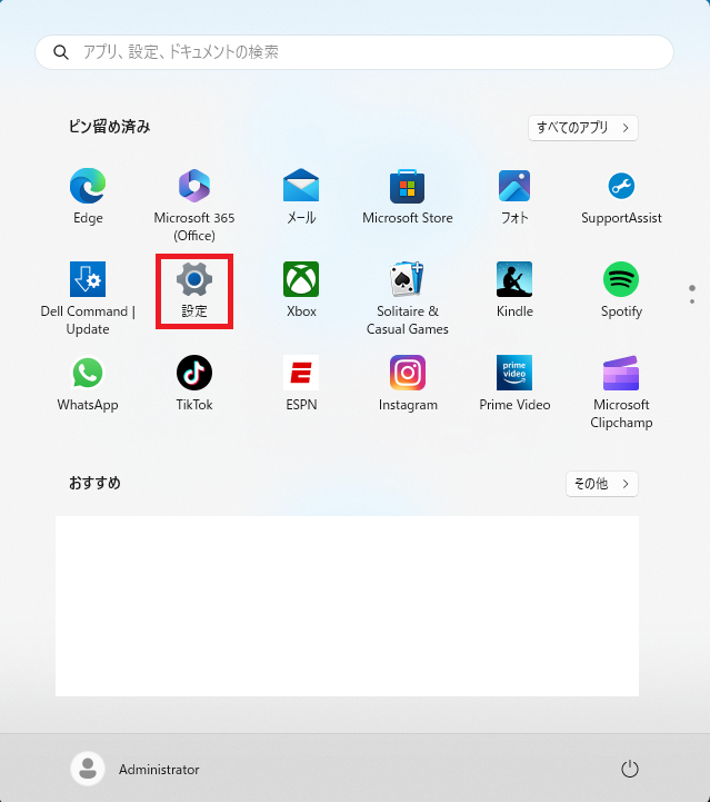 スタートメニューから「設定」を開きます。
