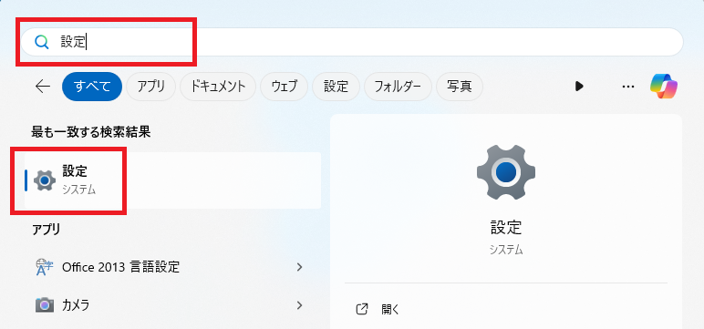 見つからなければ、上部の検索バーに「設定」と入力することでも探せます。