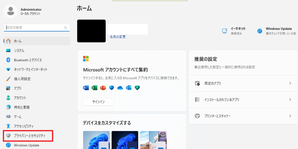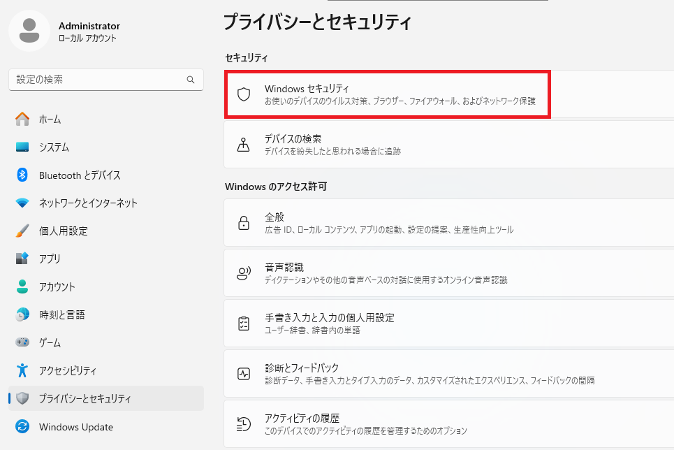 プライバシーとセキュリティーを開く(Windows11の場合)