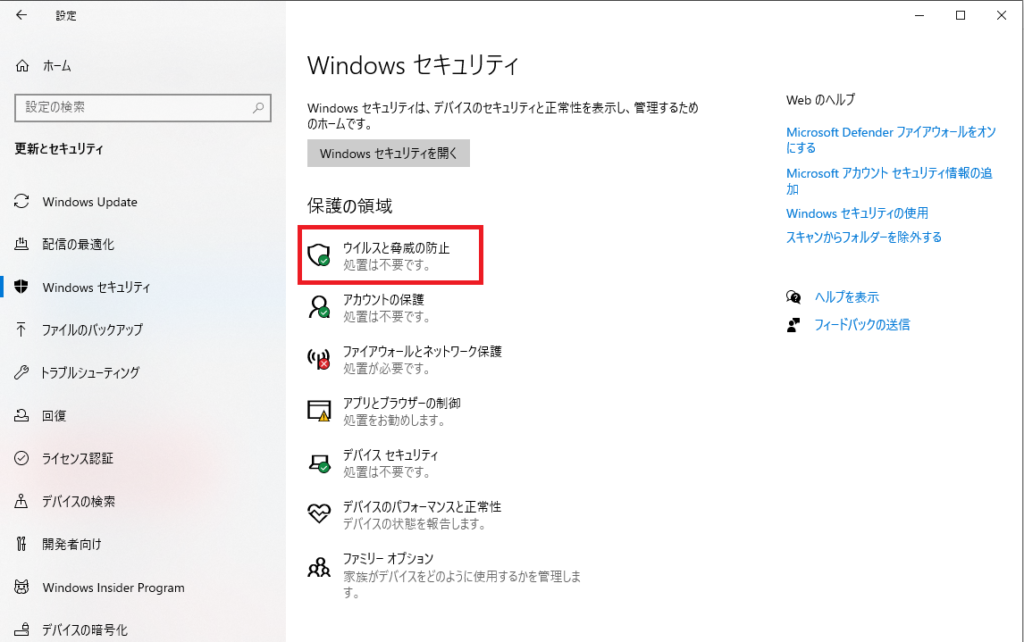 ウィルスと脅威の防止の設定を行う