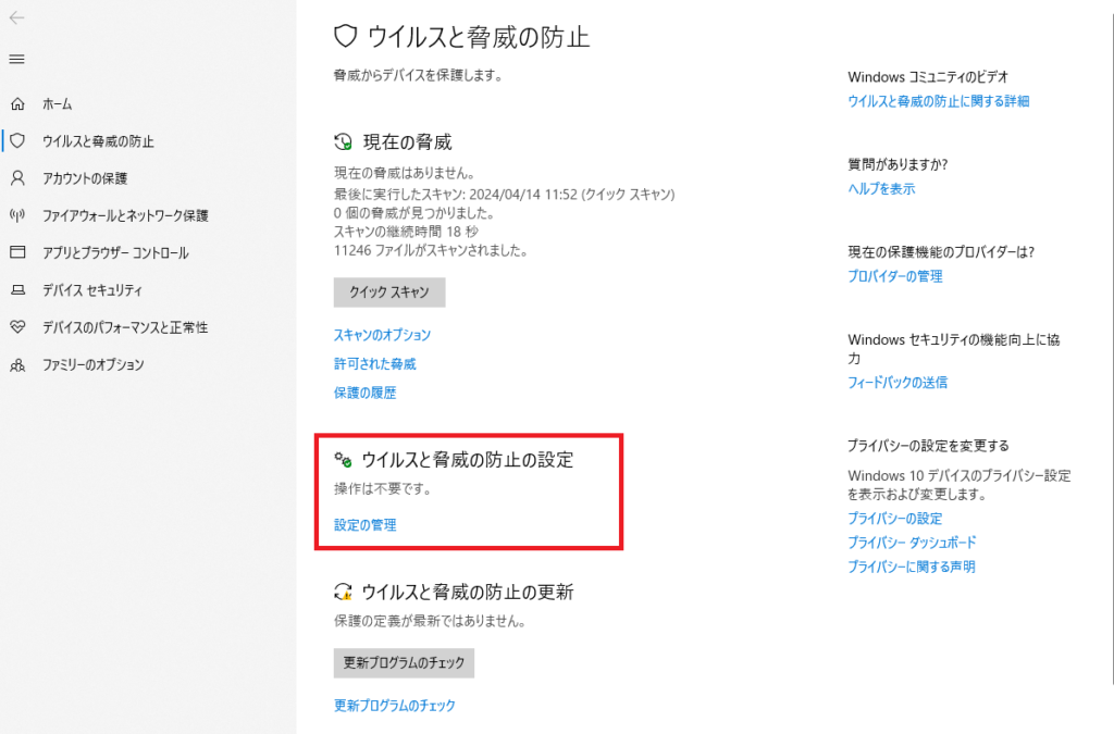 右側のメニューから、「ウィルスと脅威の防止の設定」より、「設定の管理」をクリックします。