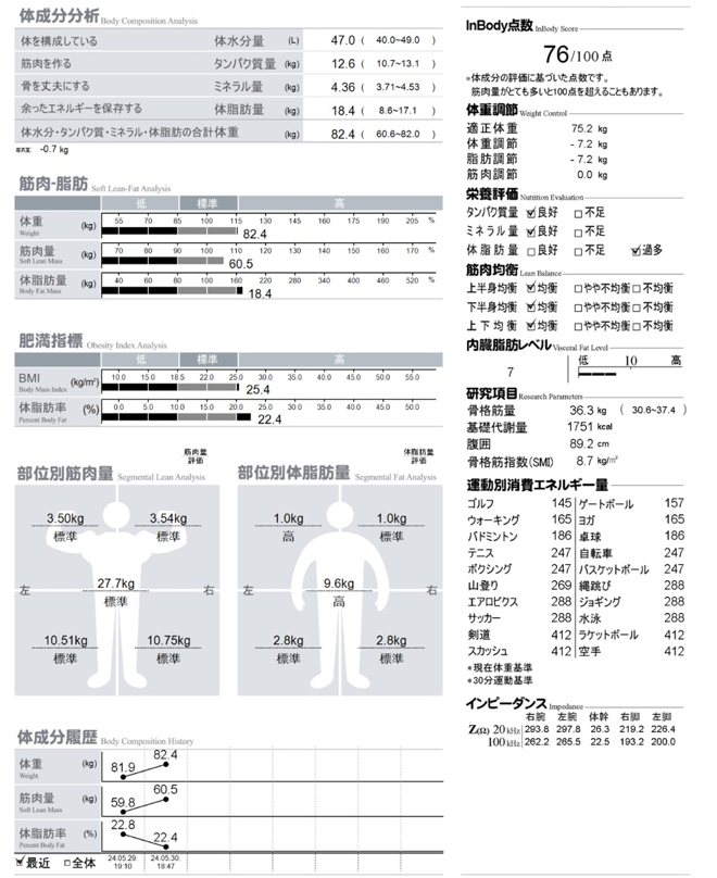 InBodyの結果を見ると、筋肉量と体水分が増えて、体脂肪が減っていました。