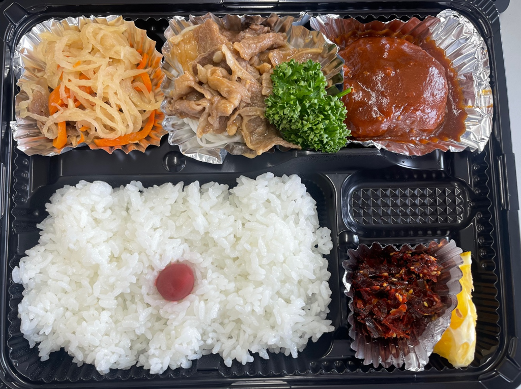 ⇒メニュー:ハンバーグ、牛焼肉、切り干し大根の煮締め、鰹昆布、甘夏