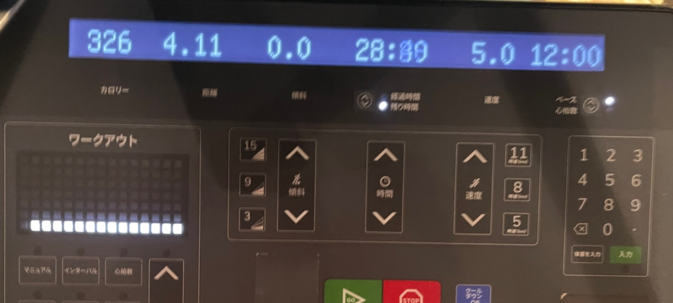 ・トレッドミル:35分(ウォーキング10分、ランニング25分)