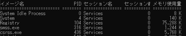 上記コマンドを入力すると、フリーズしたPCで動作しているタスクの一覧を表示できます。