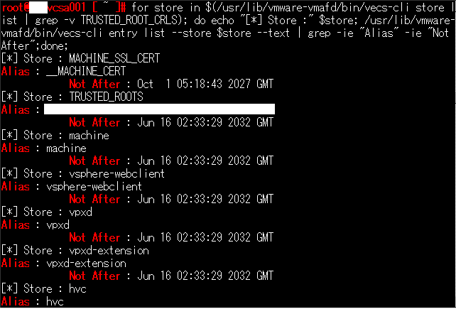 for store in $(/usr/lib/vmware-vmafd/bin/vecs-cli store list | grep -v TRUSTED_ROOT_CRLS); do echo “[*] Store :” $store; /usr/lib/vmware-vmafd/bin/vecs-cli entry list –store $store –text | grep -ie “Alias” -ie “Not After”;done;
