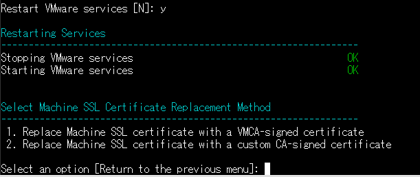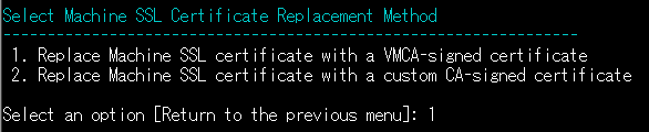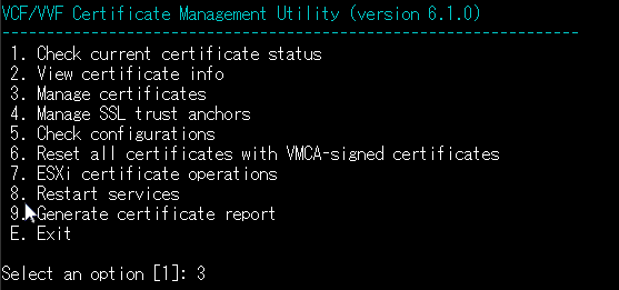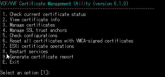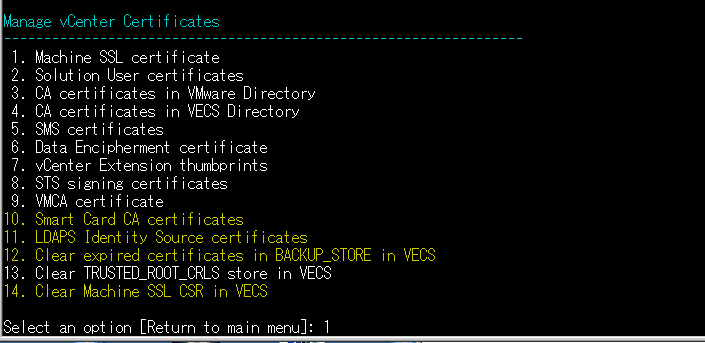 このメニュー上で「1」を選択すると、現在vCSAサーバーで認識している証明書の状況を確認できます。