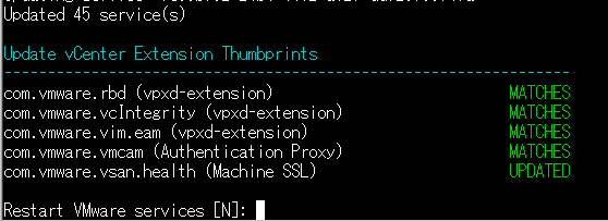 適用が完了するとサービスを再起動するかを聞かれますので、再起動して良ければ「Y」を返します。