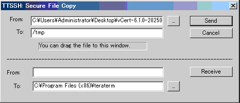 上部の送信枠内について、FromにvCertのZipファイルを選択し、Toに「/tmp」フォルダを指定します。Sendボタンをクリックしてサーバーへ転送します。